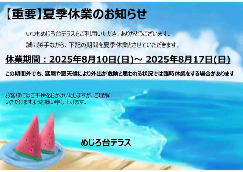 8月10日(日)~ 8月17日(日)までめじろ台テラスをお休みさせていただきます。